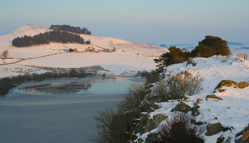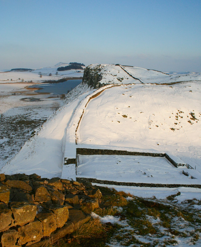 Ascending steeply, kicking my toes into fresh snow, I seek out each firm footing and haul myself up. At the milecastle atop the crags of Steel Rigg it’s definitely time to stop walking and take in the view – a combination of the two activities being far too risky. West towards Winshields Crags and East to Hotbank Crags, across brilliant snow-covered sheep pasture, the plates of the Earth’s surface have ruptured. To the south, land slopes away steadily, whilst to the north, moorland tumbles off a precipice in an abrupt sawtooth of crags and cliffs that form an eminently defensible natural frontier – geologically known as the Whin Sill. Looking tentatively down at the frozen blue waters of Crag Lough 150ft below and then towards the wild country beyond the rule of empire and law, at least that’s how it was in AD 122, it’s hard to envisage a Pictish assault proving more than a bee sting on the rump of a rhinoceros. As the sun is already low and starting to glow with a purplish winter light I finish my coffee and Christmas cake combination and crack on.