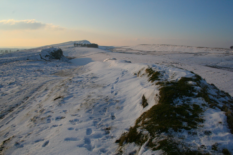 Taking the path down from the car park, even careful steps find snow deeper than my gaiters, allowing the occasionally refreshing sensation of melting ice to permeate my boots – at least I’m not wearing sandals. My mobile phone starts to chime insistently, at odds with the location and the day. I turn it off. Soon the few preceding footprints take a right fork away from Hadrian’s line, around the southern slopes of the of the crag. In contrast and in characteristically unflinching Roman style, the wall stays true to the ridge’s highest point and so must I.